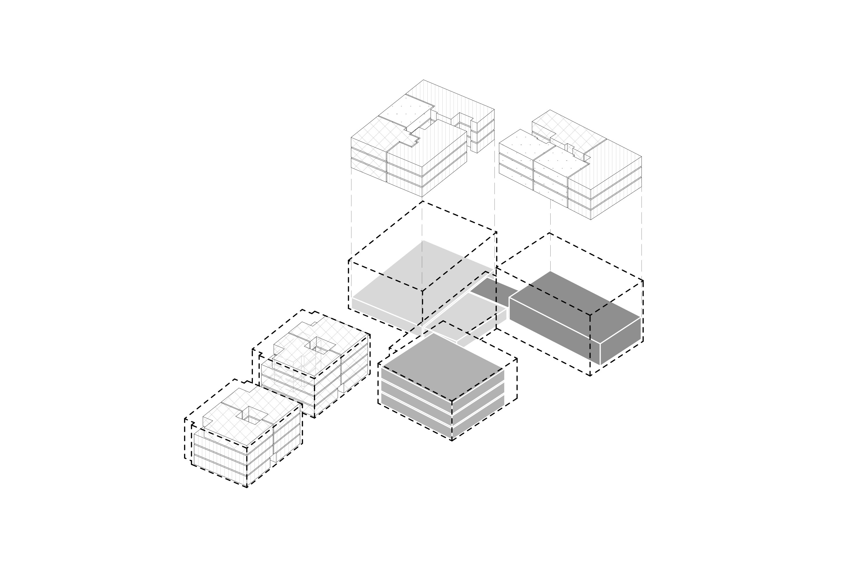 Zusammen mit dem bestehenden Gemeindehaus bilden drei neue Gebäude ein Ensemble und formulieren einen gefassten Hof welcher als neue Mitte der Gemeinde gelesen werden kann.