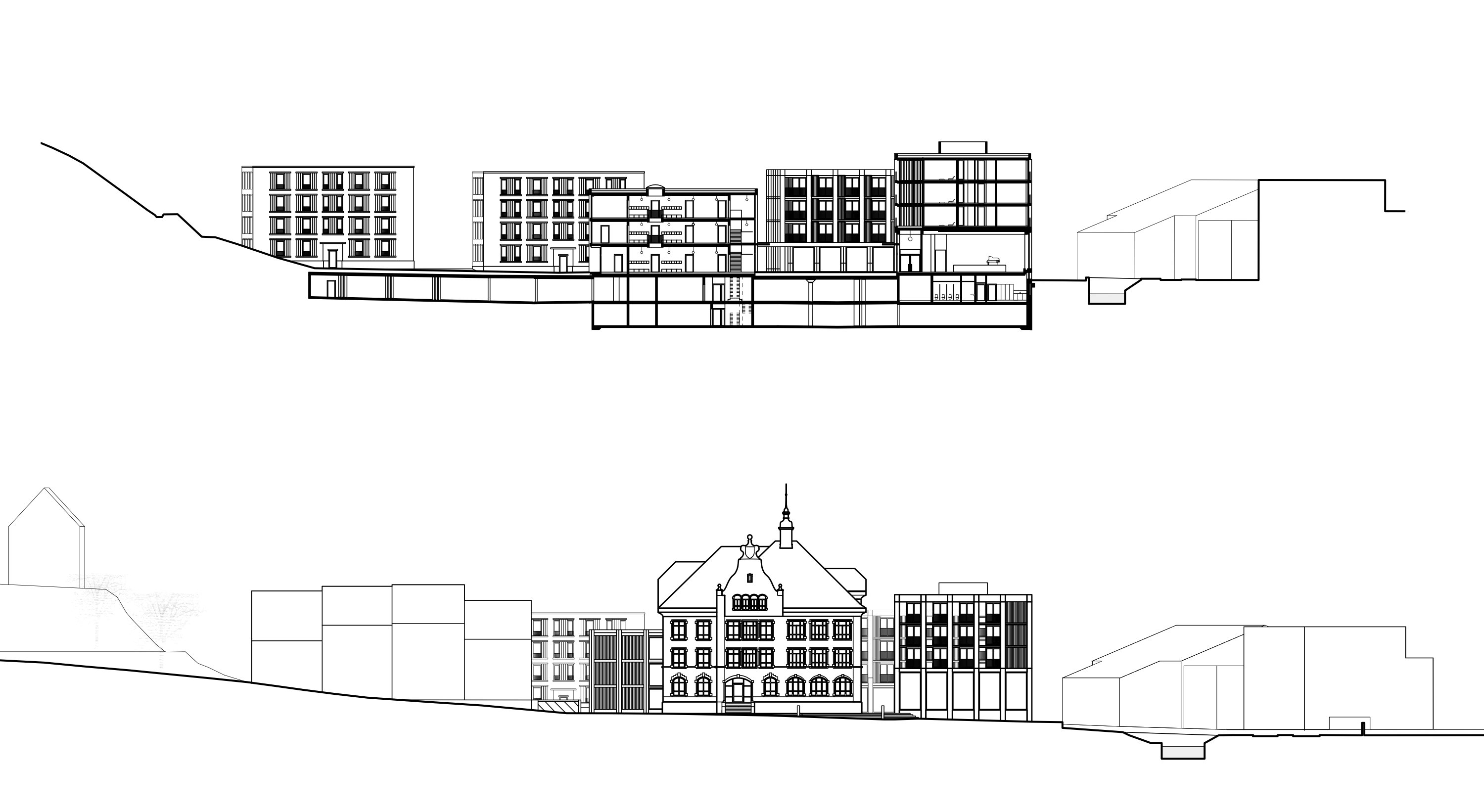 Die Obergeschosse der zwei Gebäude am „Im Grund“ dienen dem Wohnen und formulieren Nutzungsseitig einen weichen Übergang zum angrenzenden Wohnquartier.