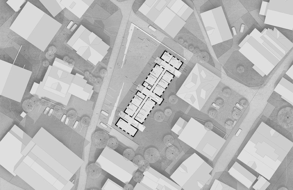 Als Sondernutzung ist der Neubau analog der Kirche ein hellgrau geschlämmter Massivbau. Durch die Gliederung des langen Baukörpers in vier Teile wird die bestehende Körnung aufgenommen. Die Eingänge für die Bibliothek, Gemeindeverwaltung und Post mit Tourismusbüro befinden sich in den Fugen zwischen den Teilen entlang des neuen Dorfplatzes.