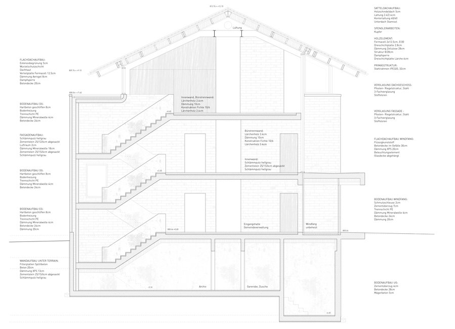 Das Gebäude der Gemeindeverwaltung hat zwei Vollgeschosse und ein Dachgeschoss. Eine zentrale Treppe und ein angrenzender Lift erschliesst das Gebäude vertikal. Die Schalter der verschiedenen Abteilungen der Verwaltung sind direkt an dem Treppenraum angeschlossen und einfach auffindbar. Beidseitig des Treppenraumes sind die Büroräume angeordnet. Die Räume sind auf einem Raster von 1.25m aufgebaut und flexibel unterteilbar.