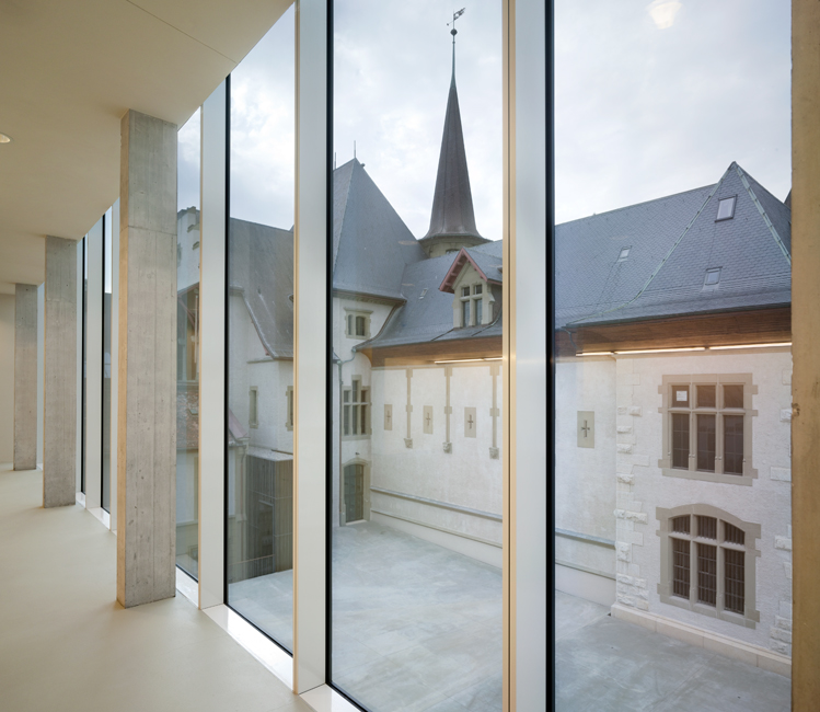 wänden umfunktioniert. Dadurch erhalten sie einen neuen Ausdruck. Im Innenraum werden die Grenzen zwischen alt und neu gezeichnet.