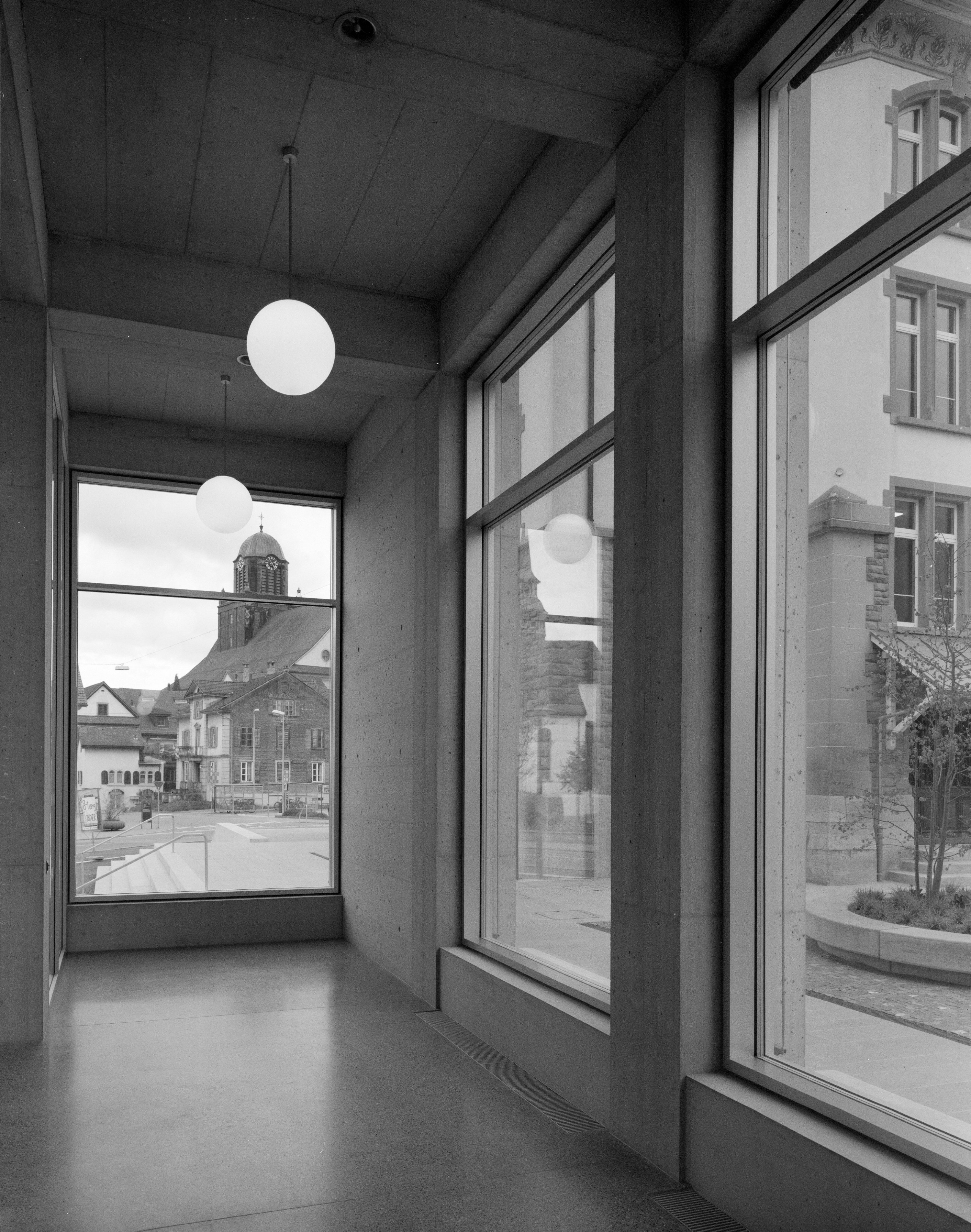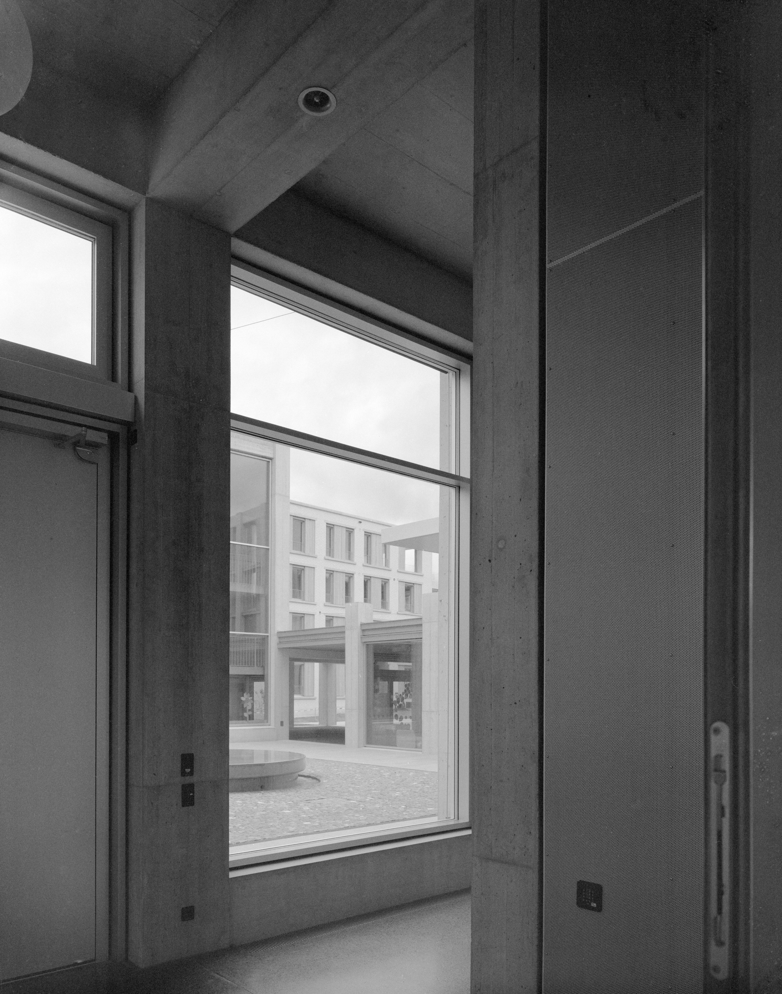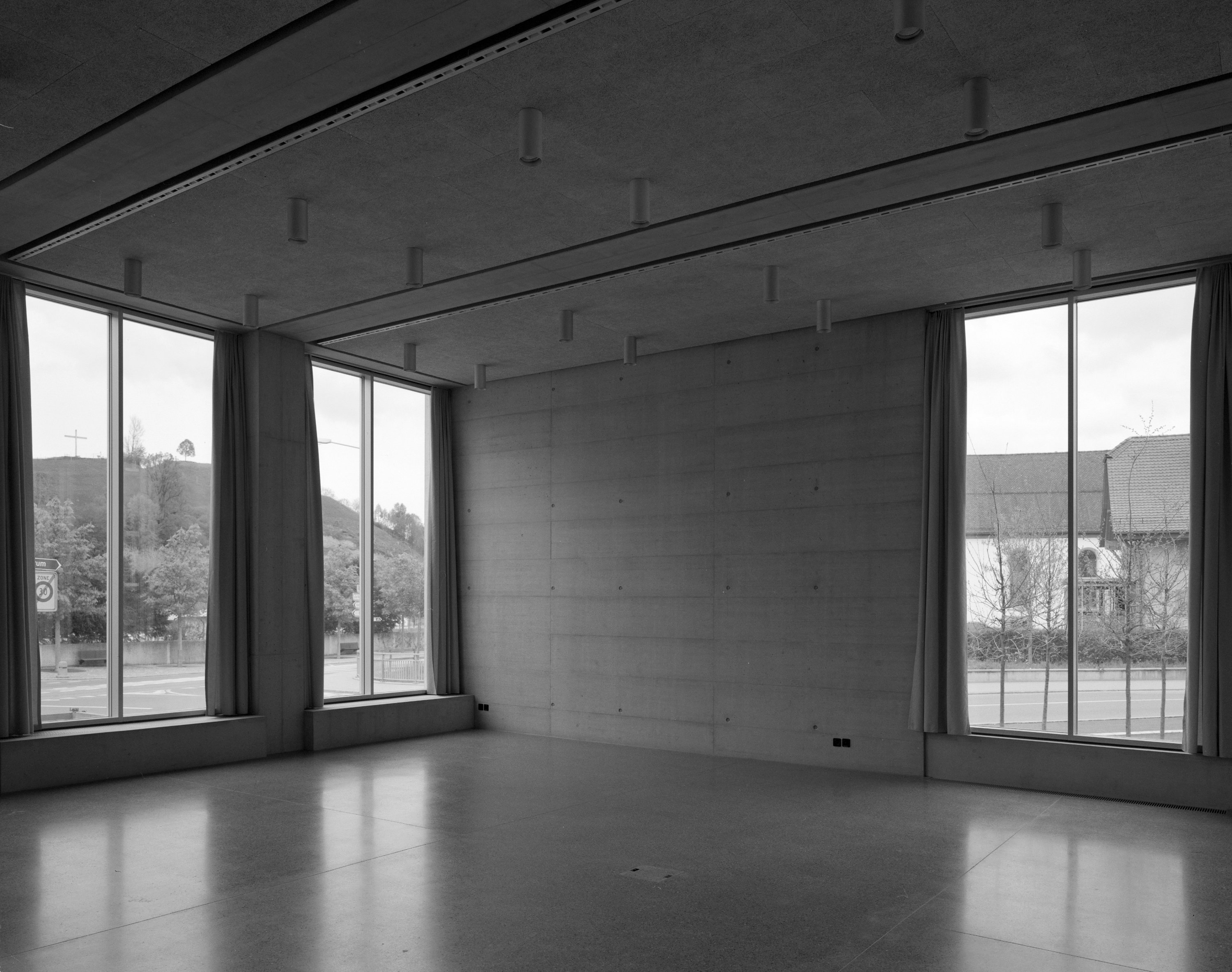 Ein zum Hof öffnendes längsseitiges Foyer erschliesst den Pfarreisaal und ermöglicht die unabhängige Unterteilung in drei gut proportionierte Räume. Einzelne grosse Öffnungen im Inneren des Saals stellen den Bezug nach Aussen sicher. Durch die Ausführung der oberen Wohngeschosse als Raumtragwerk im Betonverbund der Decke kann auf weitere Tragelemente innerhalb des Saal verzichten werden.