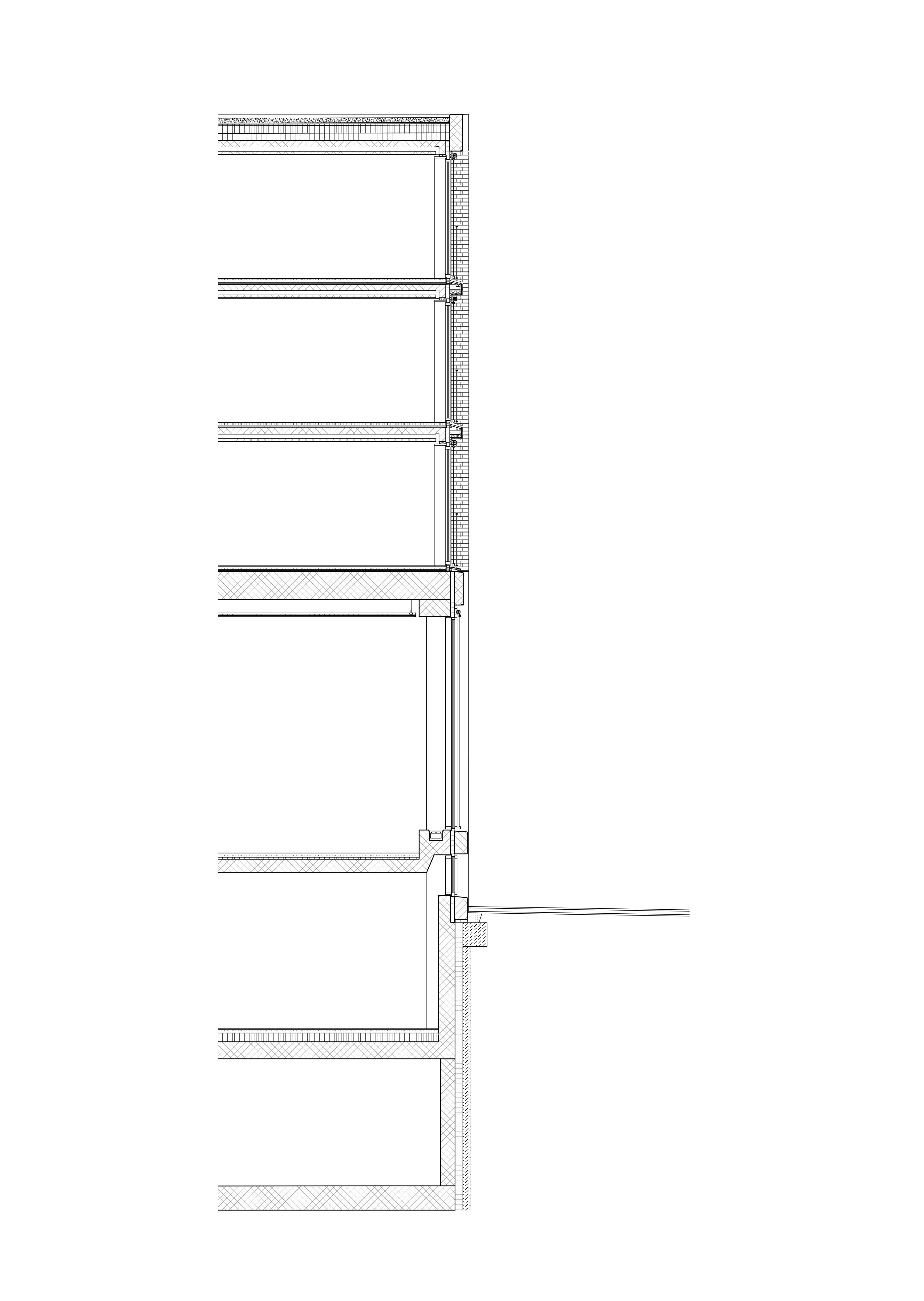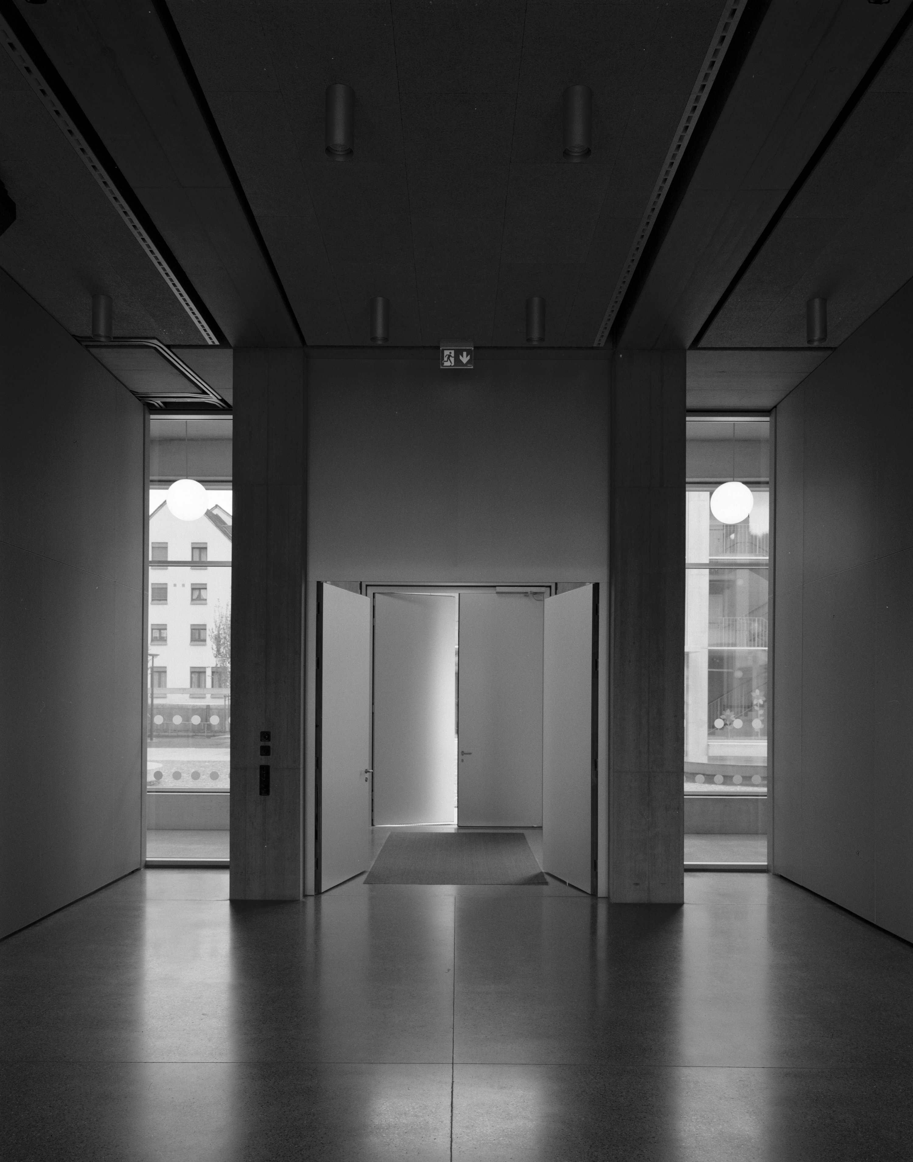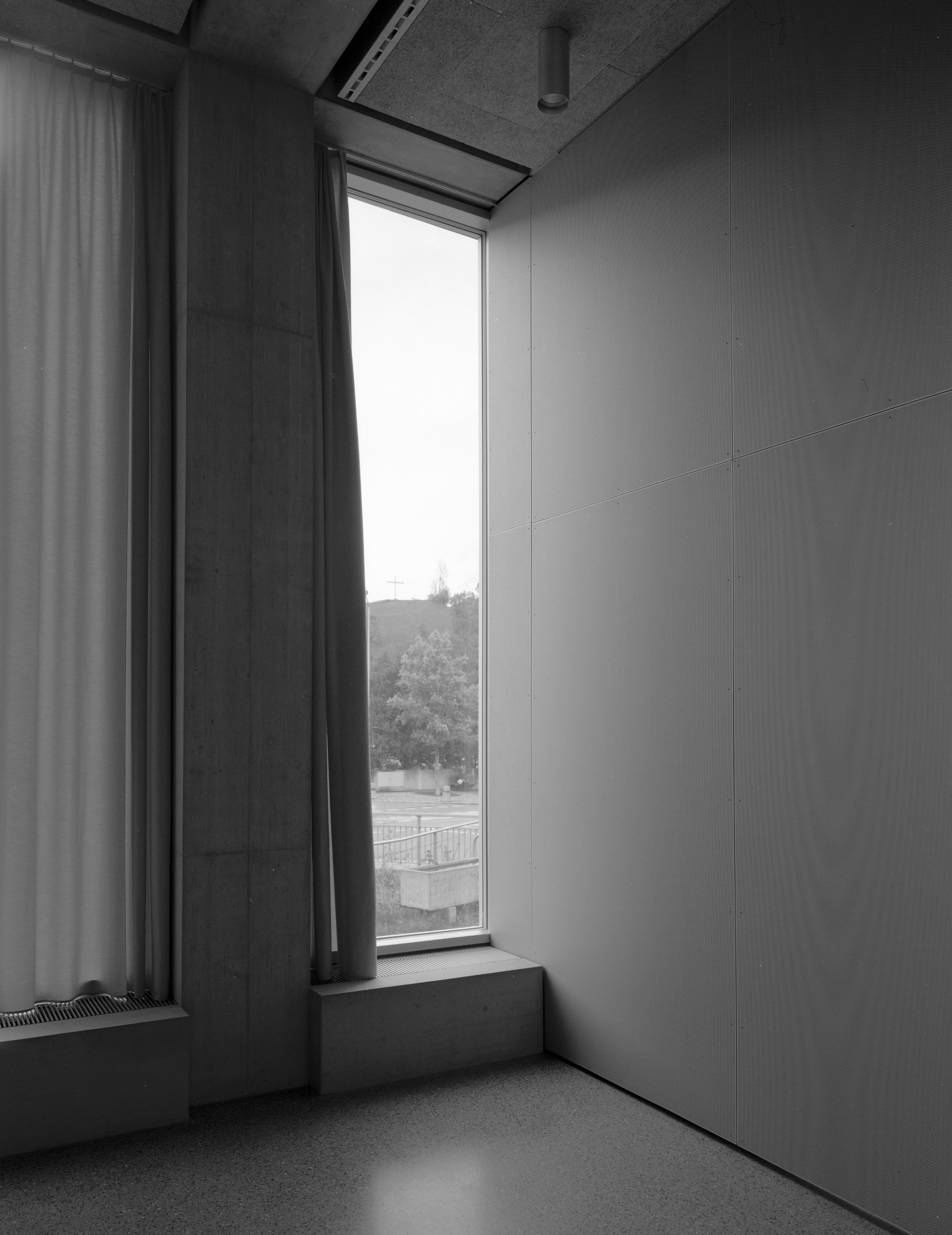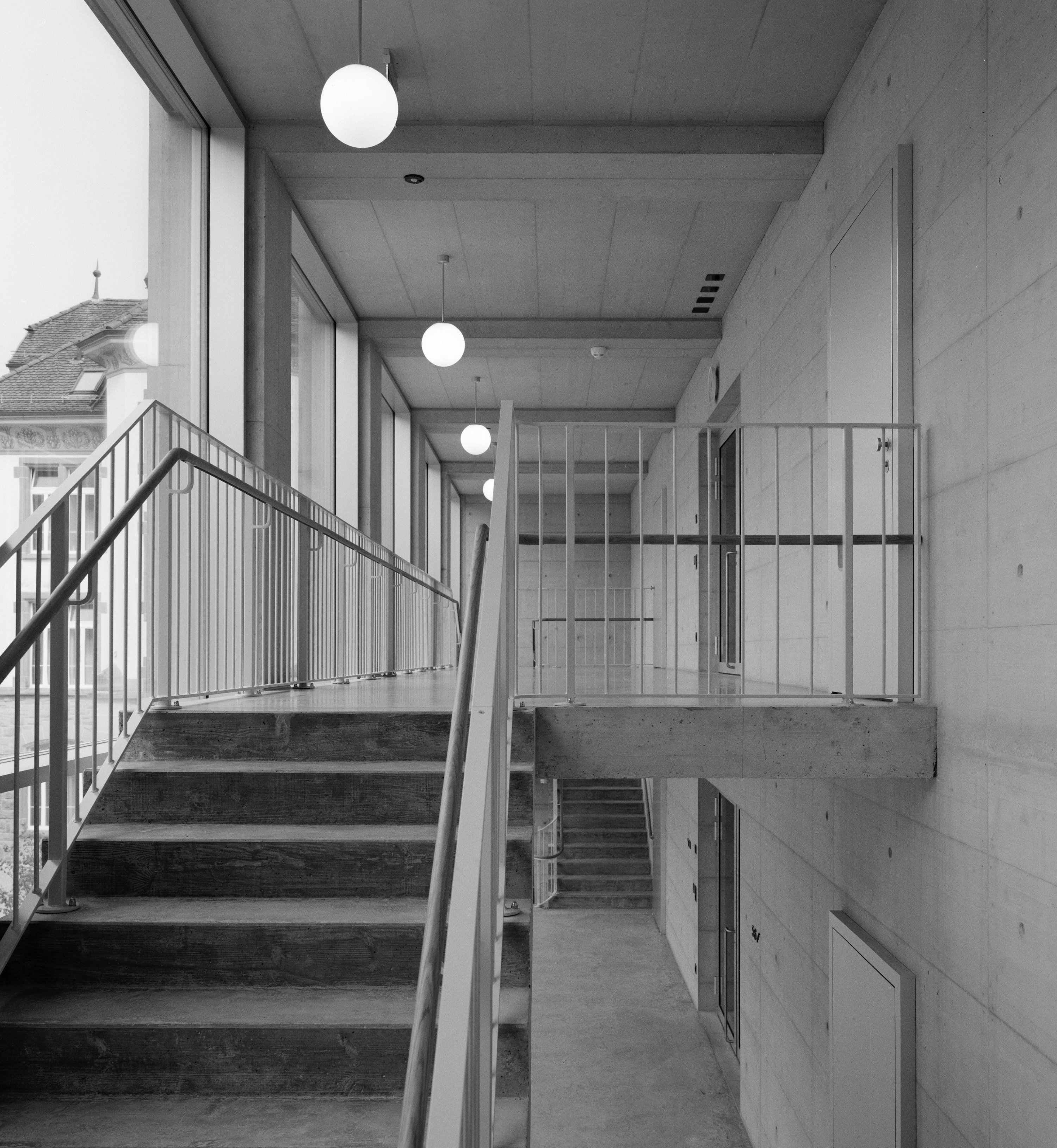 Ein zum Hof öffnendes längsseitiges Foyer erschliesst den Pfarreisaal und ermöglicht die unabhängige Unterteilung in drei gut proportionierte Räume. Einzelne grosse Öffnungen im Inneren des Saals stellen den Bezug nach Aussen sicher. Durch die Ausführung der oberen Wohngeschosse als Raumtragwerk im Betonverbund der Decke kann auf weitere Tragelemente innerhalb des Saal verzichten werden.