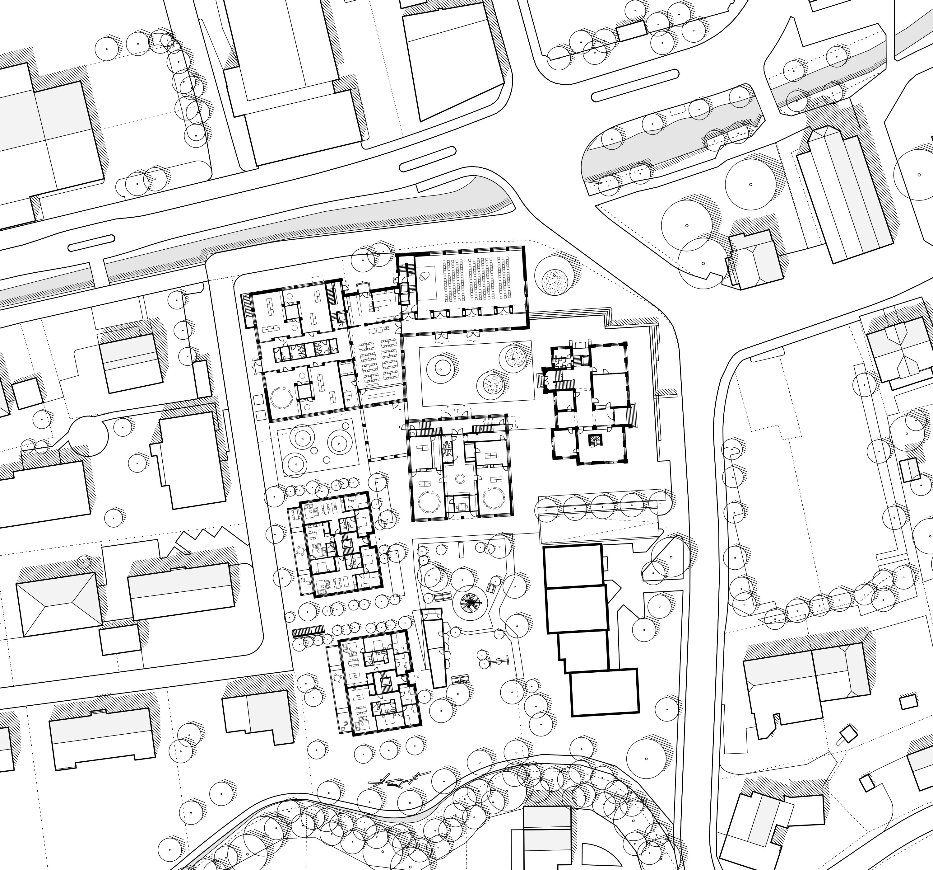 Zusammen mit dem bestehenden Gemeindehaus bilden drei neue Gebäude ein Ensemble und formulieren einen gefassten Hof welcher als neue Mitte der Gemeinde gelesen werden kann.