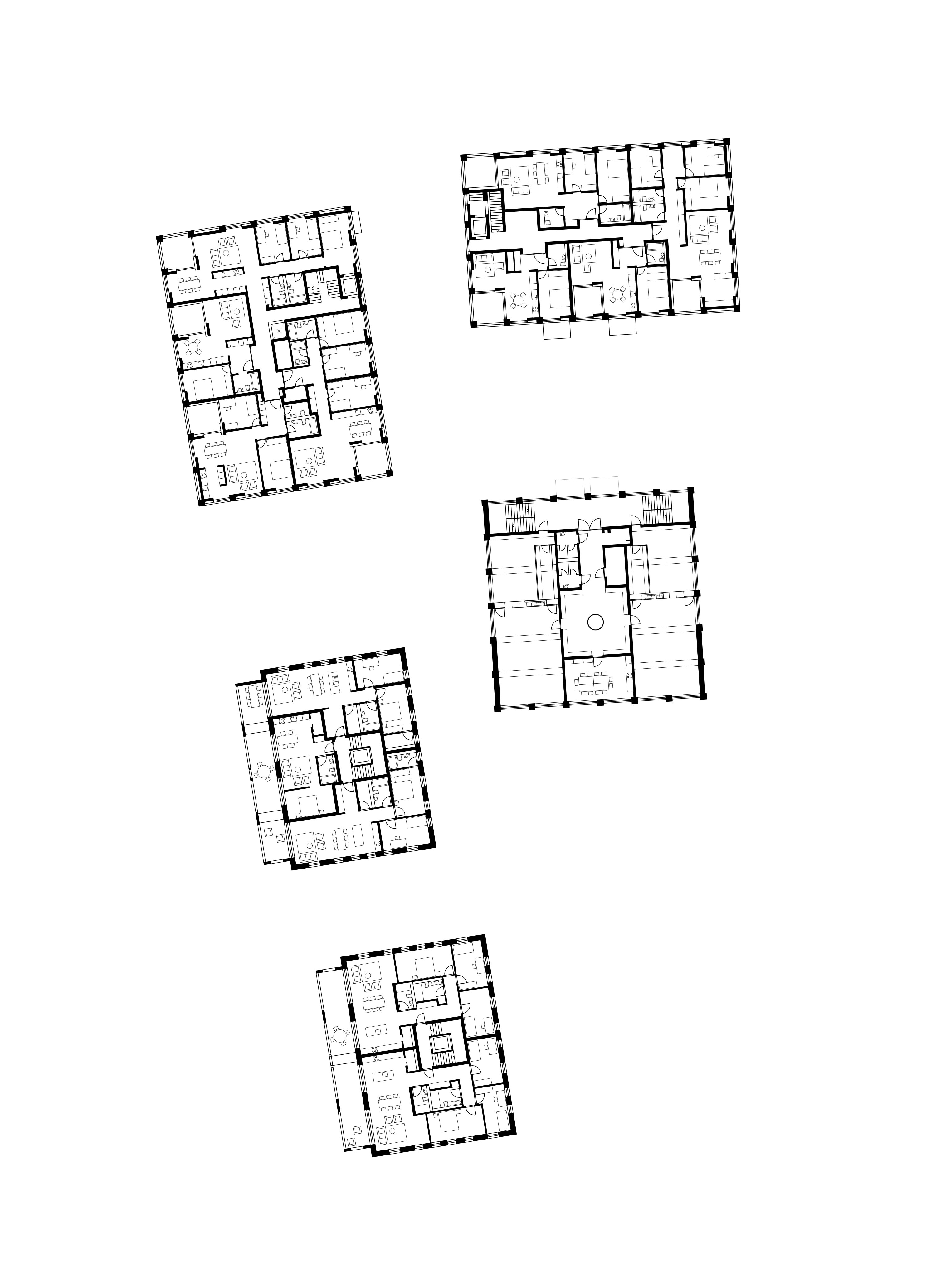 Für die Kirchgemeinde sind die Wohnungen über dem Pfarreisaal und dem Tagesheim für Kleinwohnungen effizient als vierbünder organisiert. Ihre Zugänge liegen in der Fuge der zwei Häuser am „Im Grund“ und sind gut von den öffentlichen Nutzungen getrennt.