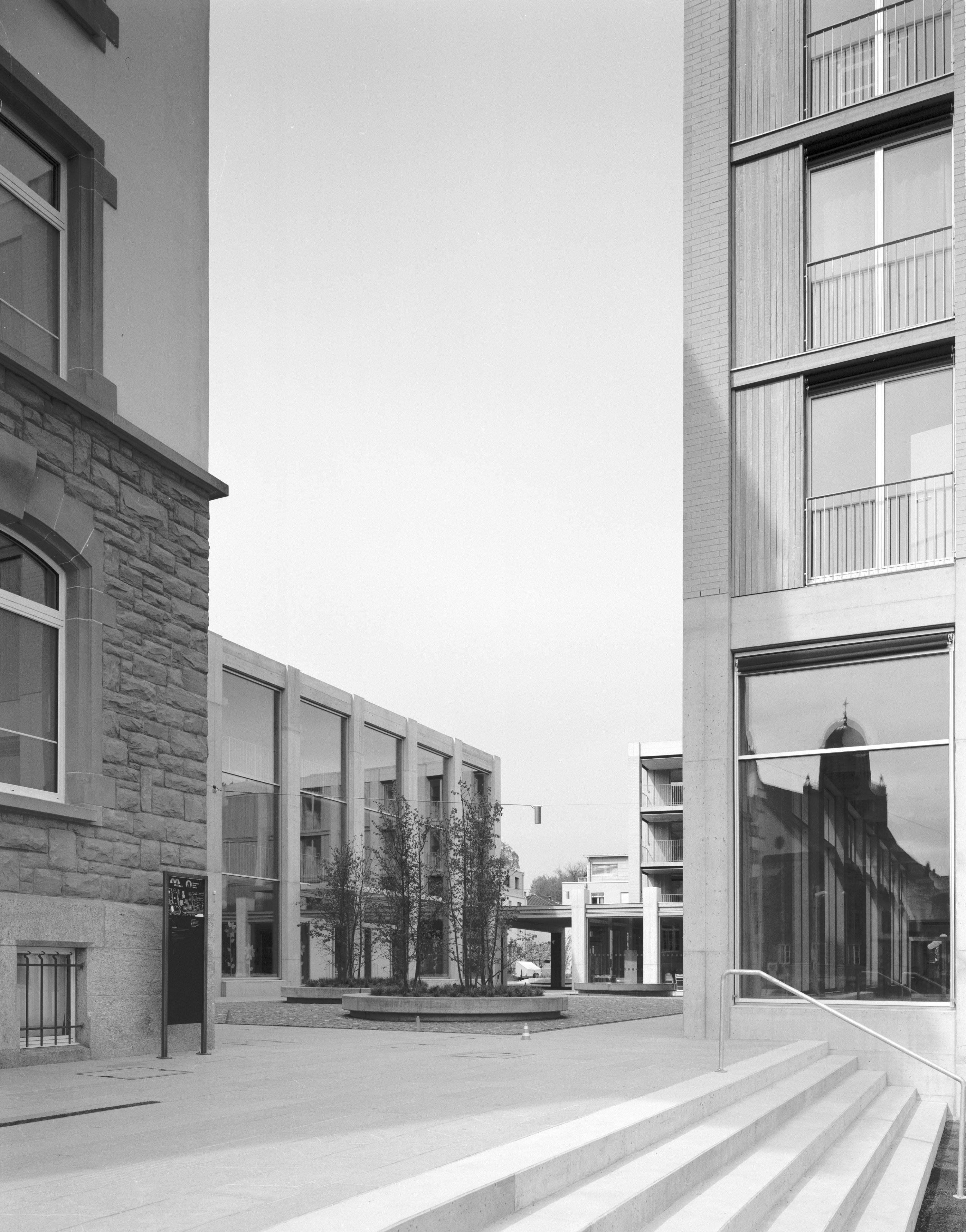 Den nördlichen Auftakt bildet der neue Pfarreisaal gegenüber dem Lustgarten mit der Heiligblut-Kapelle. Eine Fuge zwischen dem Gemeindehaus und dem Neubau bindet den Hof über eine repräsentative Treppenanlage an die Sichtachse des Obertors an.