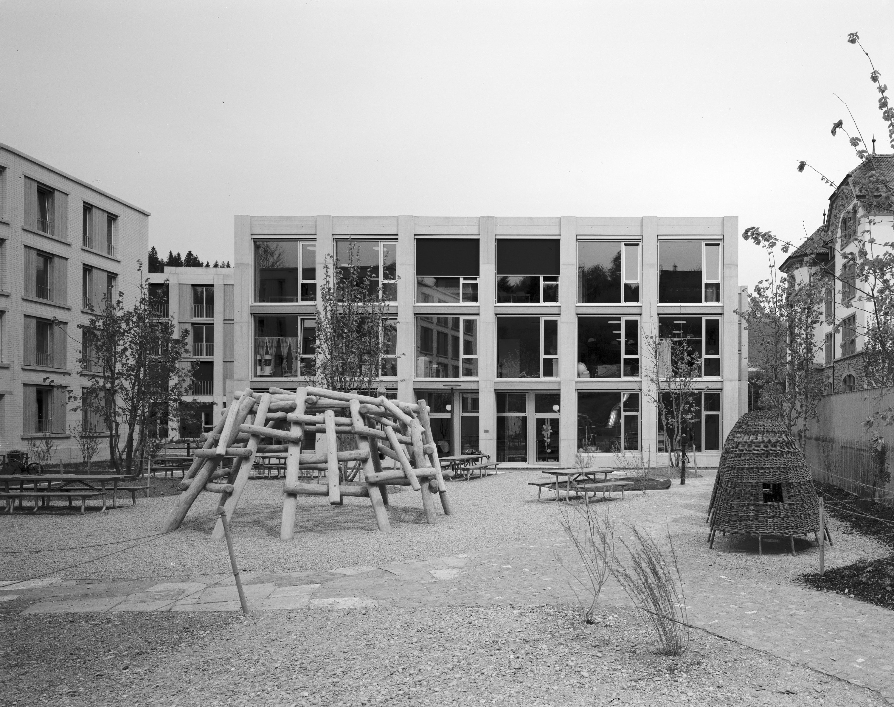 Westseitig fasst das Tagesheim und südseitig der Kindergarten den Hof.