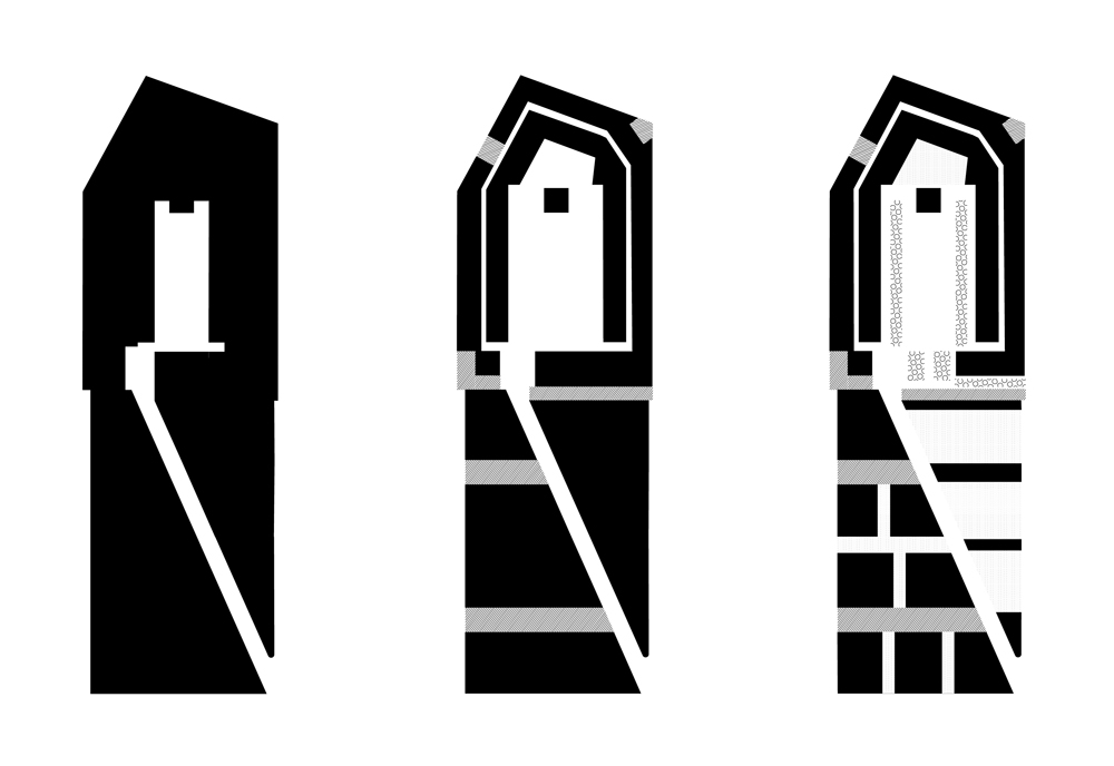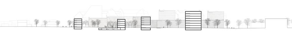 Das bestehende Setzungsmuster wird durch neue Gebäude im westlichen Rand und in zweiter Reihe im Osten ergänzt und erweitert. Die Inneren, ergänzenden Gebäude orientieren sich in ihrer Höhe an den bestehenden in der zweiten Reihe. Die äussere Bebauung nimmt dabei die Satteldachform der bestehenden auf was die Fassung der offenen Mitte zusätzlich stärkt.