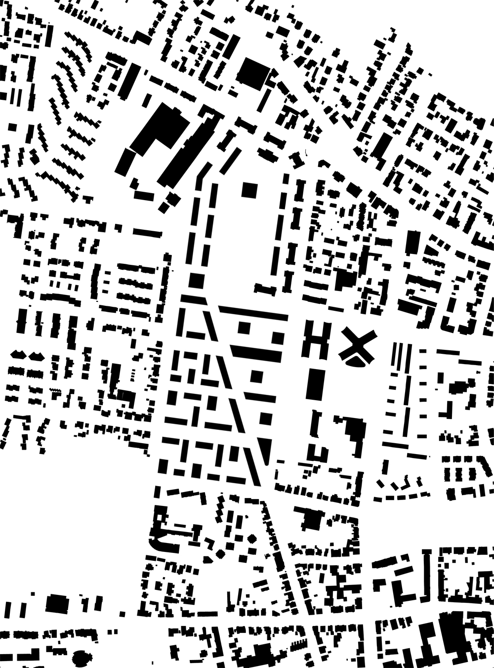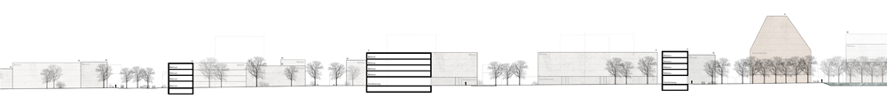 Das Bebauungsmuster ostseitig der Diagonalen stellt die Symbiose einer freien Solitär und dem einer Baufeld Typologie dar. Durchlaufende Riegel besetzen die gegenüberliegenden Strassenfluchten und Spannen dabei mögliche Erweiterungsflächen auf, welche unabhängig bespielt werden können.