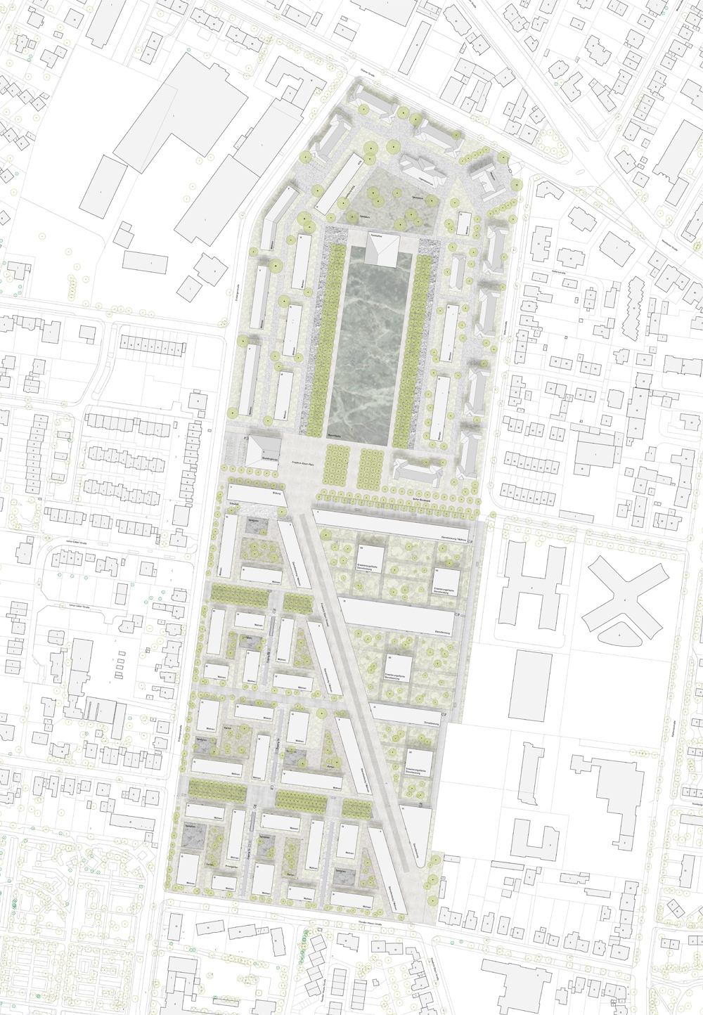 Das zu beplanende Areal teilt sich in zwei Gebiete welche städtebaulich nach ihren Potentialen völlig unterschiedlich entwickelt werden. Der Nordbereich wird durch den zentral liegenden offenen Exerzierplatz geprägt welcher zweiseitig durch die bestehenden Offiziersgebäude umspannt wird.