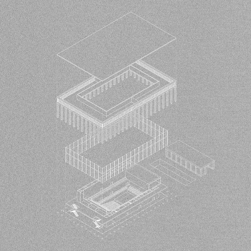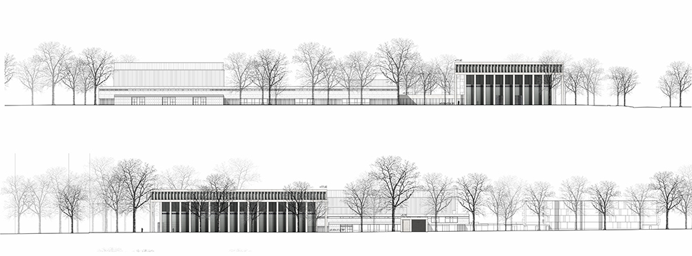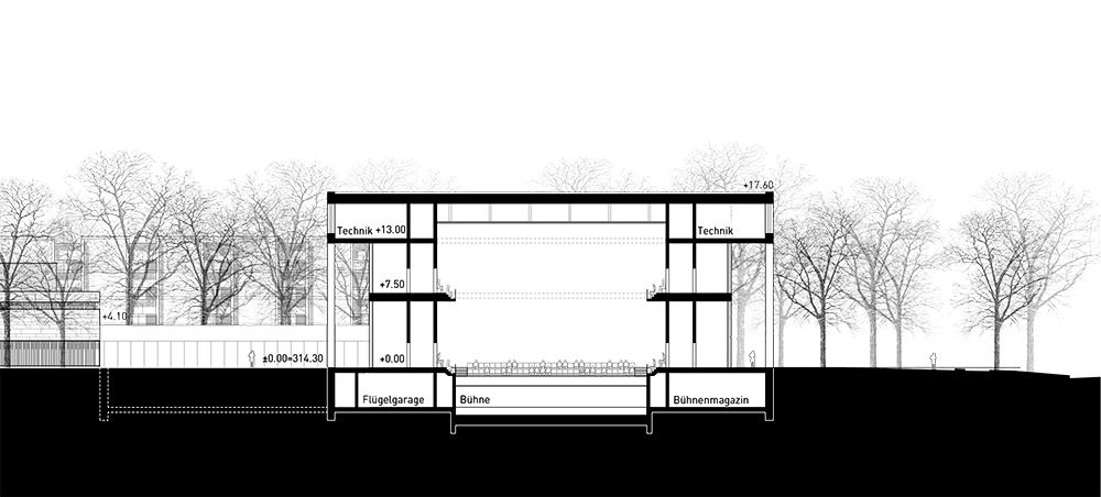 Prägendes Element des Neubaus ist der allseitig ausgebildete Arkadenraum des Hauses. Der Rücksprung bildet nicht nur den gedeckten Vorplatz sondern dient auch als Pufferzone zwischen Innen und Aussen und verstärkt die räumliche Vernetzung mit dem bestehenden Park. Ermöglicht durch die Tieferlegung des Saals öffnet sich das dahinterliegende allseitige umlaufende Foyer vollständig nach Aussen. Bühnennah liegt der Künstlerbereich im Untergeschoss dessen Belichtung über einen tiefergelegten introvertierten Hof sichergestellt wird.