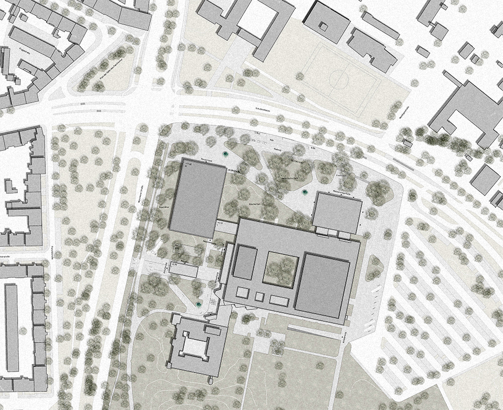 An der Nahtstelle von Grünzug und Stadtkörper gelegen, versteht sich das Freiraumkonzept als Zone der Durchdringung von Stadt und Park. In dieser Logik wird ein sinnreiches Verweben von Hartbelag und weiten, grünen Rasenschollen vorgeschlagen. Die dabei angestrebte Balance von hart und weich neigt sich bewusst zugunsten des Grüns – Erhalt und Weiterentwicklung des ruhigen Parkcharakters ist Prämisse.
