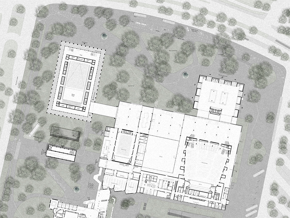 Um möglichst viel offene und freie Grünräume zu erhalten, besetzt der Neubau das Baufeld mit einem kleinen Fussabdruck. Platziert in der nord-westlichen Ecke auf der Höhe des bestehenden Zugangs- und Garderoben-Bauwerk der Meistersingerhalle bildet es einen dreiseitig gefassten Eingangshof und öffnet sich zur Schultheissallee.