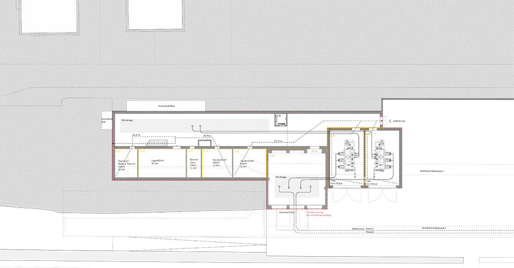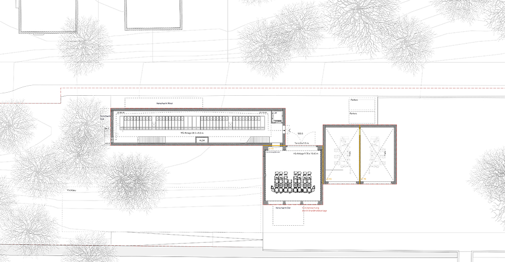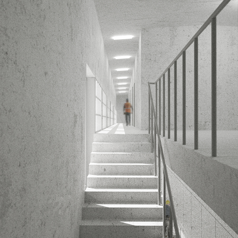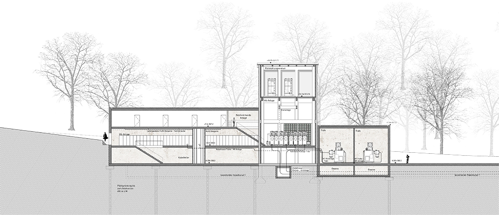 Die Transformatoren der Freiluftanlage sollen durch moderne effizientere Anlagenteile abgelöst und nach Innen gelegt werden. In einem neuen Volumen setzen sich die Trafos nördlich vor den Turm. Es ist ein flaches ruhendes Gebäude welches auf der Plattform steht, die Komposition abschliesst und wieder ins Gleichgewicht setzt. Alle drei Gebäudeteile fassen strassenseitig einen kleinen Hof. Dieser bildet die räumliche Adresse und den zentralen Zugang zur Anlage.