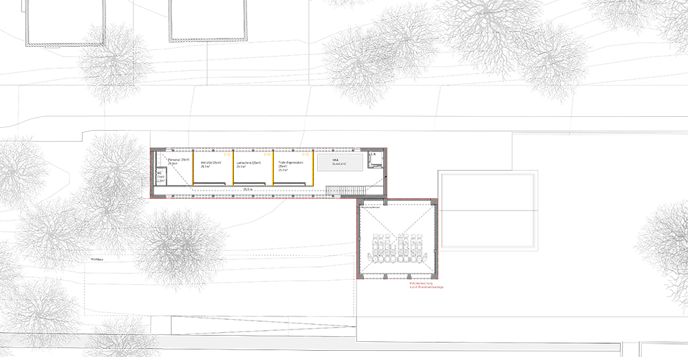 An ihre Stelle tritt ein neues liegendes Gebäude, welches westseitig an den Turm anschliesst und als schmaler Körper strassenbegleitend in den Hang hineinläuft.