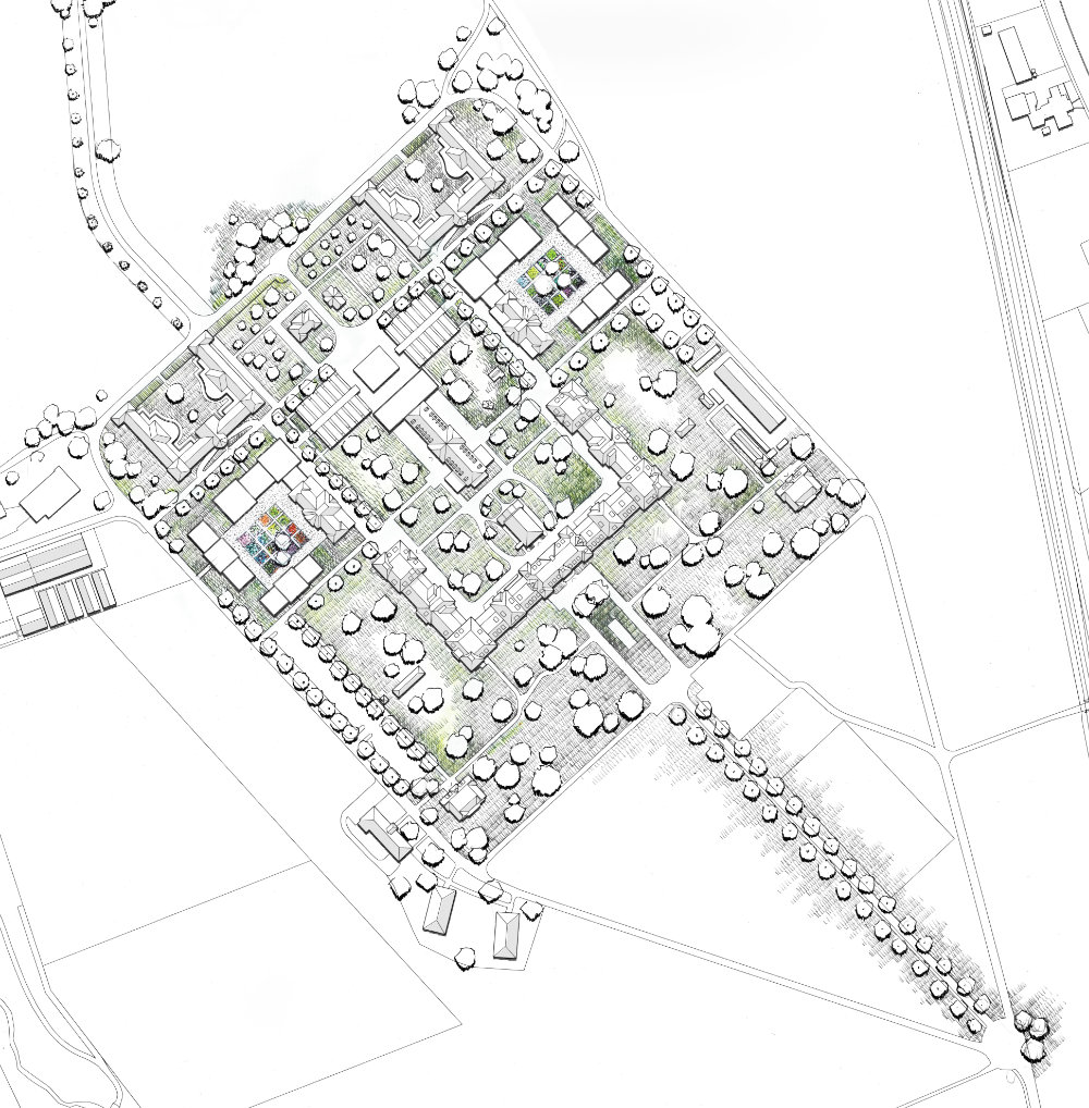 Dabei wird dem Ensemblegedanken und der Einbettung in die Typologie der historischen Anlage besondere Beachtung geschenkt. Die Aufreihung der Bestandesbauten wird mit Neubauten fortgesetzt, welche zwei neue seitliche Gartenhöfe fassen. Die Neubauten orientieren sich an der Materialität und Logik der Bestandesbauten, deren Ausdruck auf unaufgeregten Gliederungen, Schichtungen und Rasterungen beruht.