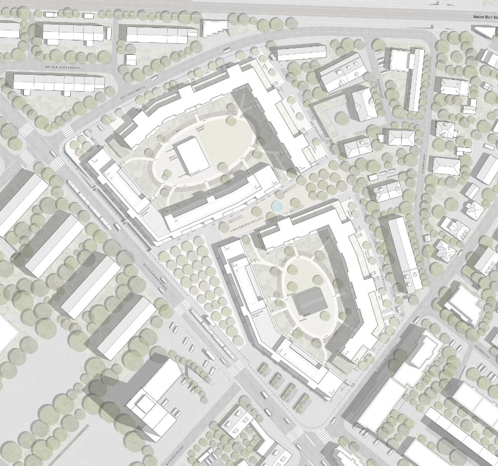 In der Verlängerung der Werkgasse schliesst die neue Setzung an und bildet mit einem Platz den räumlichen Auftakt an der Stöckackerstrasse. Die Bethlehemstrasse bildet das städtische Rückgrat mit Tramhaltestelle und öffentlichem Begegnungsraum. Die neue Bebauung tritt hier zurück und eröffnet einen dreieckigen grosszügigen Stadtplatz, bestückt mit einem Baumdach.