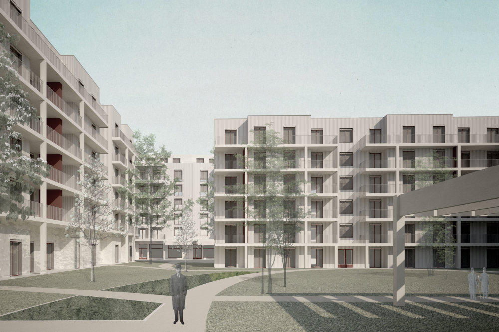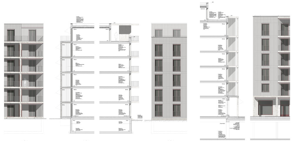In den Stadtriegeln wird ab dem 1. Obergeschoss und in den Hofriegeln ab dem Hochparterre gewohnt. Beide Gebäudetypologien sind effizient als Vier Bündner mit offenen grosszügigen Treppenhäusern aufgebaut, welche auch als Begegnungsort und im Hofriegel sogar als Aussenräum fungieren. Als Basis der Wohntypologie dient das Durchwohnen. Zwei der Wohnungen pro Treppenhaus spannen von Fassade zu Fassade und zwei von Fassade zu Treppenhaus, Laubengang.