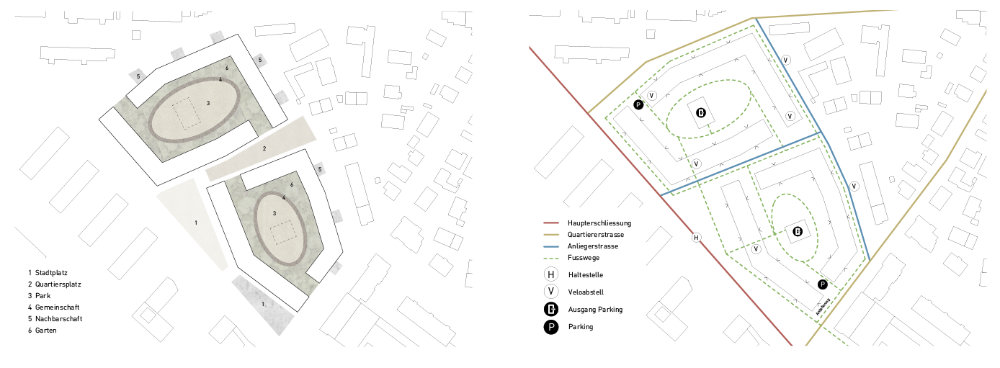 Im Sinne einer städtebaulich verträglichen Etappierung wird die neue Quartiersüberbauung analog der bestehenden Struktur in zwei Teilen Aufgebaut. Anstatt einer offenen Zeilenbauweise, werden die Bereiche als grosse an den Ecken offenen Hofhäuser ausgebildet. Jeder Hof wird durch zwei Gebäudeteile gefasst und besitz eine Aussen- und Innenseite. Im Süden der Stöckackerhof, im Norden der Keltenhof.
