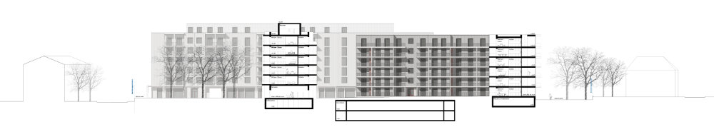 Der Hofriegel hat zusätzlich ein zurückspringendes Attikageschoss welches als zwei Bündner organisiert ist. Das Dach der Stadtriegel beherbergt Leichtbaukonstruktionen für die Wasch- und Trockenräume mit Anschluss auf die gemeinsame Dachterrasse.