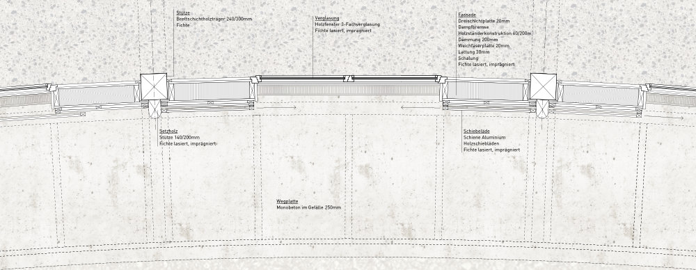 Mit der unabhängigen Planung des Gebäudes von der Parkierung können die Raumgeometrien und das Volumen optimiert und in die Umgebung integriert werden. Das geplante Volumen ist kompakt und eingeschossig. Die Holzstruktur bindet grosse Mengen an C02 und kann aus den regionalen Wäldern gefertigt werden. Sie ist entsprechend der Belastungen und Spannweiten in den Dimensionen und Form angepasst und die Systembauweise ermöglicht eine kurze Rohbauphase ohne Austrocknungszeiten.