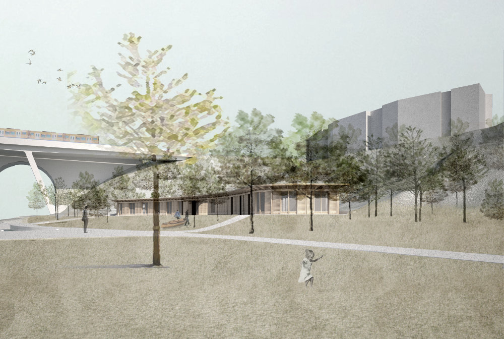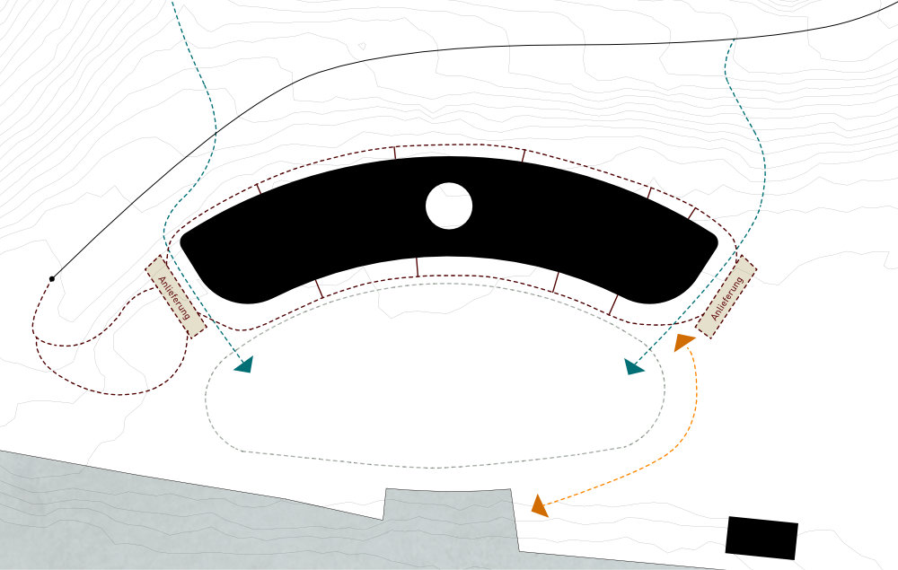 Ausgehend von der ansteigenden Topografie wird das Infrastrukturgebäude am abflachenden Fuss, mittig im Baubereich platziert. Zentral von der Auswasserungsanlage wird der Neubau radial aufgebaut. Selbstverständlich schmiegt sich das Gebäude an den Böschungsfuss um einen möglichst grossen Freiraum zur Aare zu erhalten und diesen räumlich zu fassen.