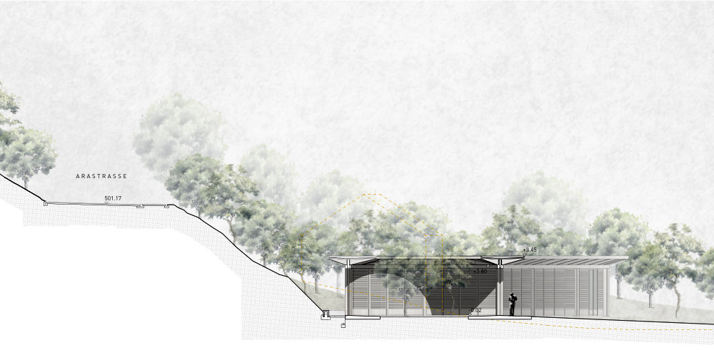 Das Gebäude steht frei vom Hang gelöst und ist zweiseitig ausgerichtet. Die abgerundeten Stirnseiten verstärken die Einbettung und stellen links und rechts des Gebäudes den Anschluss über eine Landschaftstreppe zum Strassenniveau und Quartier sinnfällig her. Der motorisierte Verkehr wird nicht in den Aare Raum geführt und dieser behält die Qualität des abgeschlossenen Naturraums.