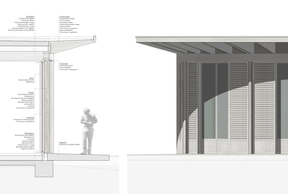 Der geplante Baukörper setzt sich aus einer Bodenplatte von 25cm Beton und einer Holzskelettkonstruktion zusammen. Die Skelettkonstruktion besteht aus Pfosten und in Querrichtung aus raumüberspannenden Brettschichtholzträgern mit einer Höhe von 56 cm. Die horizontale Aussteifung wird durch zwei T-förmige Wände und 20 cm dicken Holzverbundplatte im Dach erreicht.