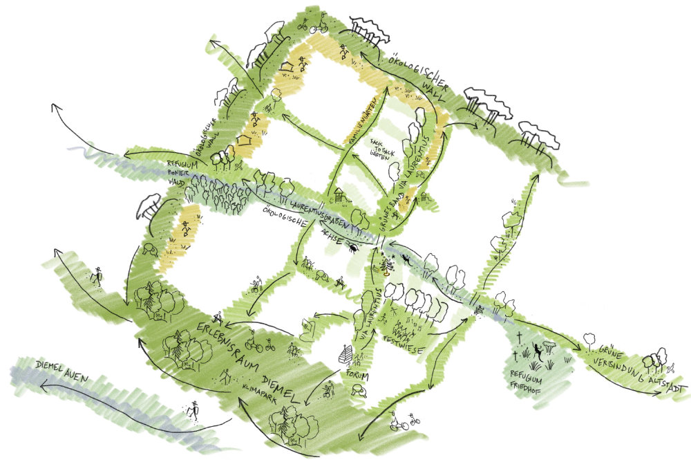 Der Laurentiusgraben wird als wichtige ökologische Achse zwischen den beiden Refugien Friedhof und dem Pionierwald auf der Deponie verstanden. Der Korridor zwischen den beiden Patches dient als wichtige Austauschfläche und Wanderkorridor für Flora und Fauna. Ein naturnah konzipierte Spielplatz sowie ein Lernbauernhof laden zum spielerischen Naturerlebnis im Westen des Perimeters, südlich des Grabens ein. Elemente wie Matschbereiche, Sitzecken und kleine Spielbereiche bilden eine für Kinder und Jugendliche anregende und spannende Umgebung, die das Naturerleben, das Naturverständnis und damit auch die allgemeine Entwicklung fördert. Vielfältige natürliche Strukturen wie Ruderalflächen, Kiesflächen, Findlinge und Baumstämme bereichern die Umgebung zusätzlich und bieten Anreiz für spielerische Herausforderungen. Verweilmöglichkeiten sowie eine Buvette bietet für Eltern und Großeltern attraktive Aufenthalts- und Begegnungsorte im Herzen des Quartiers. Der Laurentiusplatz südlich des neuen Stegs bildet zusammen mit den Gebäuden aus öffentlicher und gewerblicher Nutzung, sowie der Bushaltestelle - die Stadtteilmitte.