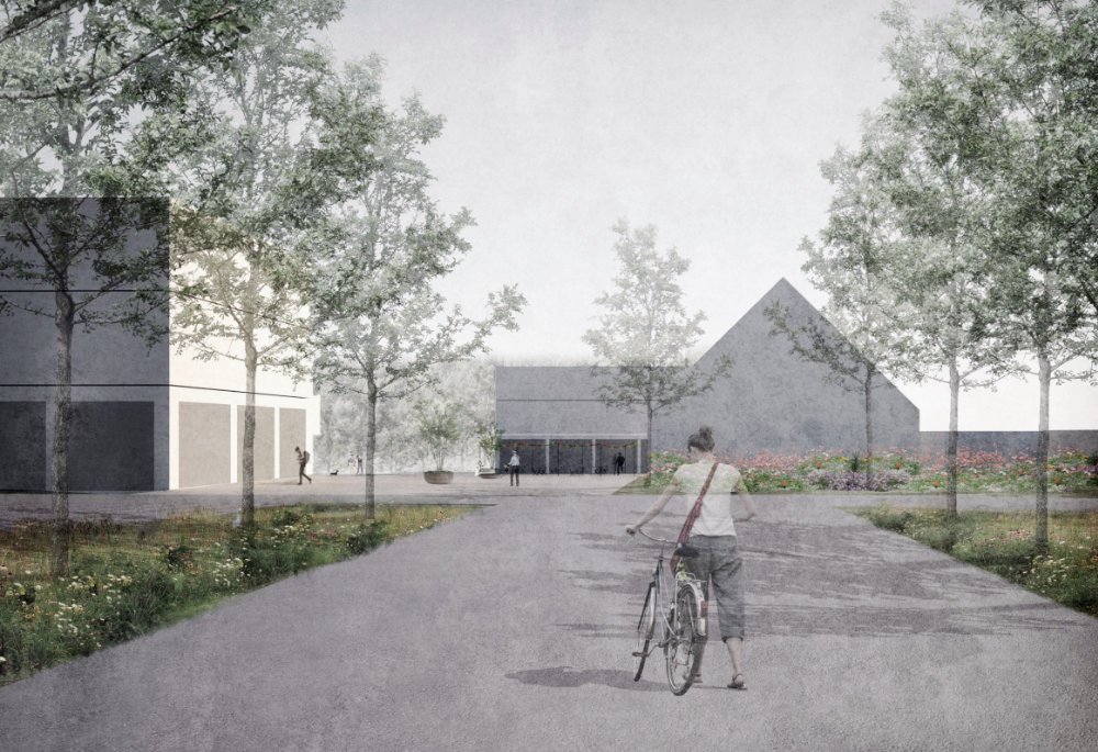 Der Eingang zum Areal und Anschluss an das bestehende Verkehrsnetz erfolgt am Stiepenweg. Geführt von der bestehenden Baumreihe, vorbei am Verwaltungsbau mit Hof, öffnet sich ein Platz am neuen Forum. Zusammen mit dem Haus Bethlehem und der St. Laurentius Kirche wird der Ort mit einem Saal für Veranstaltung in Kunst und Kultur südlich an der Stelle der Aula räumlich gefasst und mit einer Haltestelle besetzt. Zwischen Kirche und Begegnungszentrum wird die vorhandene Böschung eingeebnet und das obere Niveau sanft angeschlossen. Die Zufahrt der Anlieferungszone ist einseitig sichergestellt.