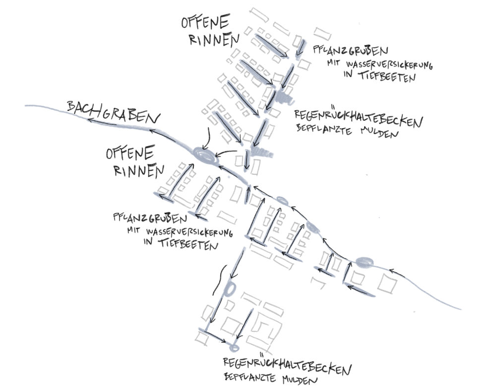 Senkrecht anschließende, den Höhenlinien folgende, verkehrsberuhigte Bereiche erschließen die Ein- und Doppelfamilienhäuser, dessen private Gärten „back to back“ mit einem Fuß- und Fahrradweg direkt vernetzt werden.