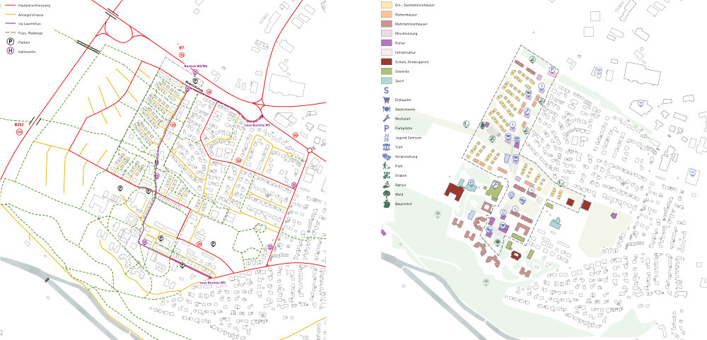 Ein neues Jugendzentrum mit Vorplatz bildet den Übergang zum ehemaligen Bolzplatz, welcher zur Festwiese transformiert wird. Im Norden und Süden durch zwei Riegel räumlich gefasst, ist seine Nutzung vielfältig und flexibel. Zwei Kiesflächen an den Ecken ergänzen die Wiesenanlage. Die bestehende westliche Baumreihe wird zur Allee ergänzt und führt zum Laurentiusplatz, welcher durch die angrenzende Quartierskantine bespielt und mit einer Bushaltestelle optimal erreicht wird. Die neue Buslinie, als Feinerschließung und Midi-Buslinie gedacht, ist durch die Stadt hindurch an den Bahnhof angeschlossen und könnte so z. B. über die Landfurt und den Göringsgraben auch zurück als Ringlinie ausgebildet werden.