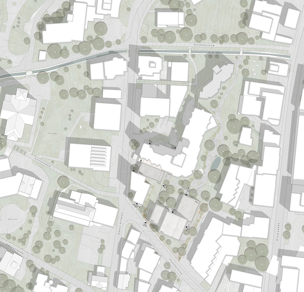Der Neubau wird als gestaffeltes, dreiteiliges Volumen direkt an die Platzstrasse gesetzt. Zusammen mit Haus C, bildet der Neubau den südlichen Abschluss des Zentrum Guggerbach. Die Gebäudehöhen der umliegenden Häuser übernehmend, fügt sich der Neubau rücksichtsvoll in die bestehende Bebauung und das städtebauliche Gefüge ein. Durch die Platzierung am südlichen Rand des Areals wird die Beeinträchtigung gegenüber bestehender Gebäude, bezüglich Verschattung und Bebauung, so gering wie möglich gehalten.