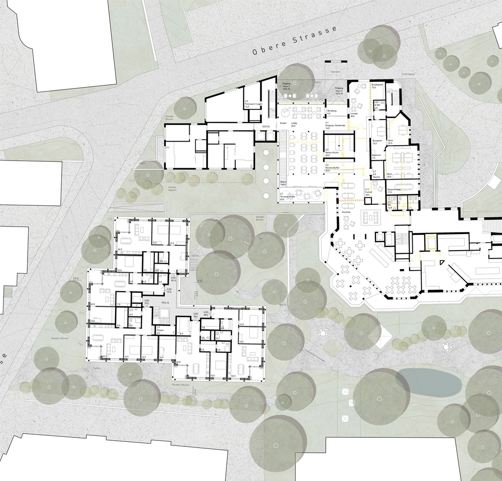Der neue Haupteingang befindet sich in einem markanten Zwischenbau an der Oberen Strasse. Von hier aus werden die Häuser A und C sowie der Neubau Haus D und die Gartenanlage erschlossen. Durch die periphere Setzung des neuen Volumens, wird der Garten durch einen ruhigen Hof ergänzt. Zusammen bilden sie das neue grüne Herz der Anlage.