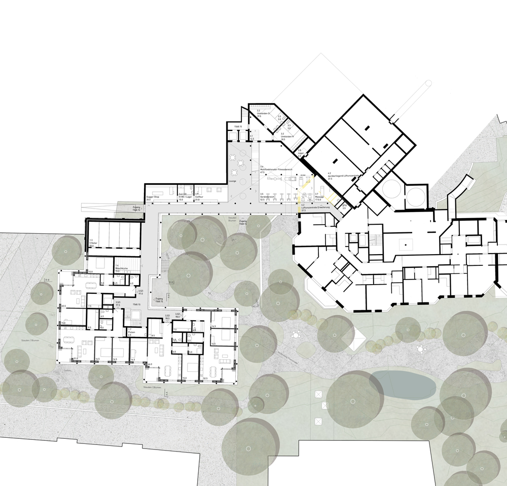 Der neue Hauptzugang, ein Einschubvolumen, wird als Fuge zwischen Haus C und Haus A organisiert. Hier tritt ein grosses Vordach mit Wandscheibe, das den Eingang strassenräumlich markiert und gleichzeitig Witterungsschutz beim Aussteigen bietet, zum Vorschein. Über einen Windfang gelangt man an die Schnittstelle zwischen Alt und Neu und kann von dort alle Zentrumshäuser erreichen. Linksseitig empfängt die neue Rezeption mit angrenzender Lounge und Briefkastenanlage. Rückseitig befindet sich das Backoffice mit Büros und Besprechungsräumen.