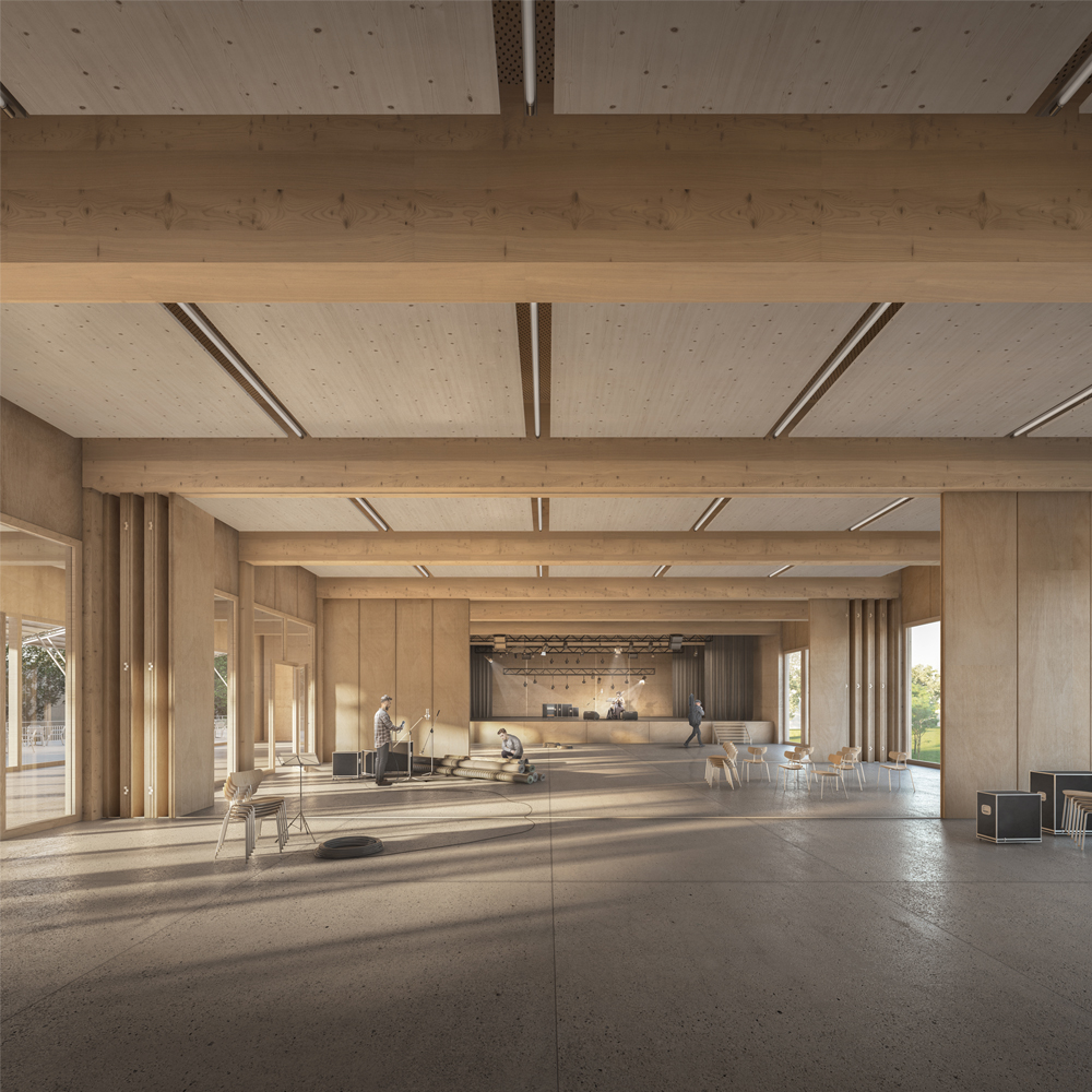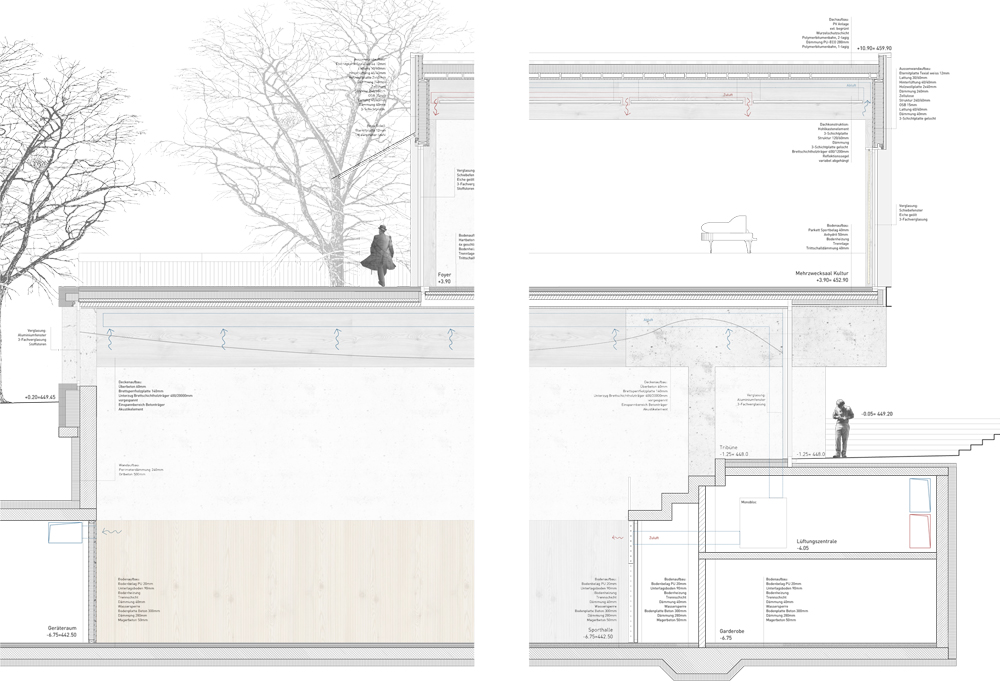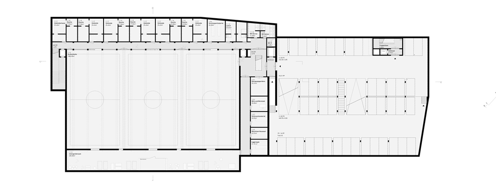 In der Eingangshalle werden die öffentlichen Nutzungen der Anlage erschlossen: der Kultursaal,  die Sporthalle sowie die Tribüne. Die präzise Platzierung der Gebäudevolumen und Freiflächen erlaubt zudem Sichtbeziehungen zwischen der Halle und der Bernstrasse.
