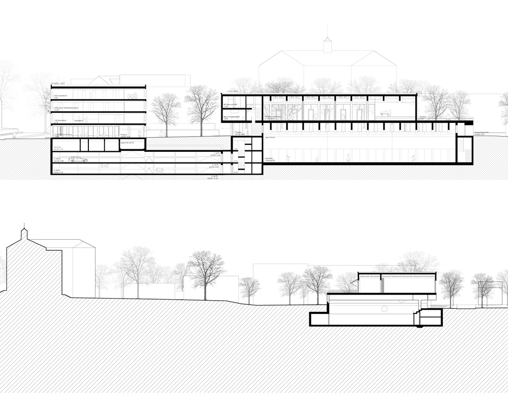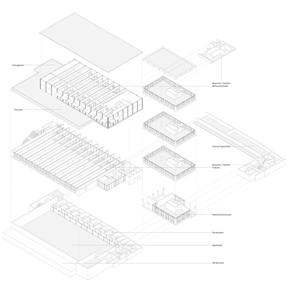 Die Kultur- und Sporthalle besteht aus zwei übereinandergelagerten Volumen, wodurch das Gebäude gegen Engematte weniger gross in Erscheinung tritt und sich rücksichtsvoll in die Umgebung einfügt. Zudem entsteht durch den Rücksprung eine Terrasse für den Kulturbereich -als Erweiterung des Foyerbereichs- als auch Platz für einen Schulgarten. Das Erdgeschoss ist zum Sockel ausgebildet, wodurch die Gliederung des Gebäudes eine weitere Differenzierung erhält und den menschlichen Massstab berücksichtigt.