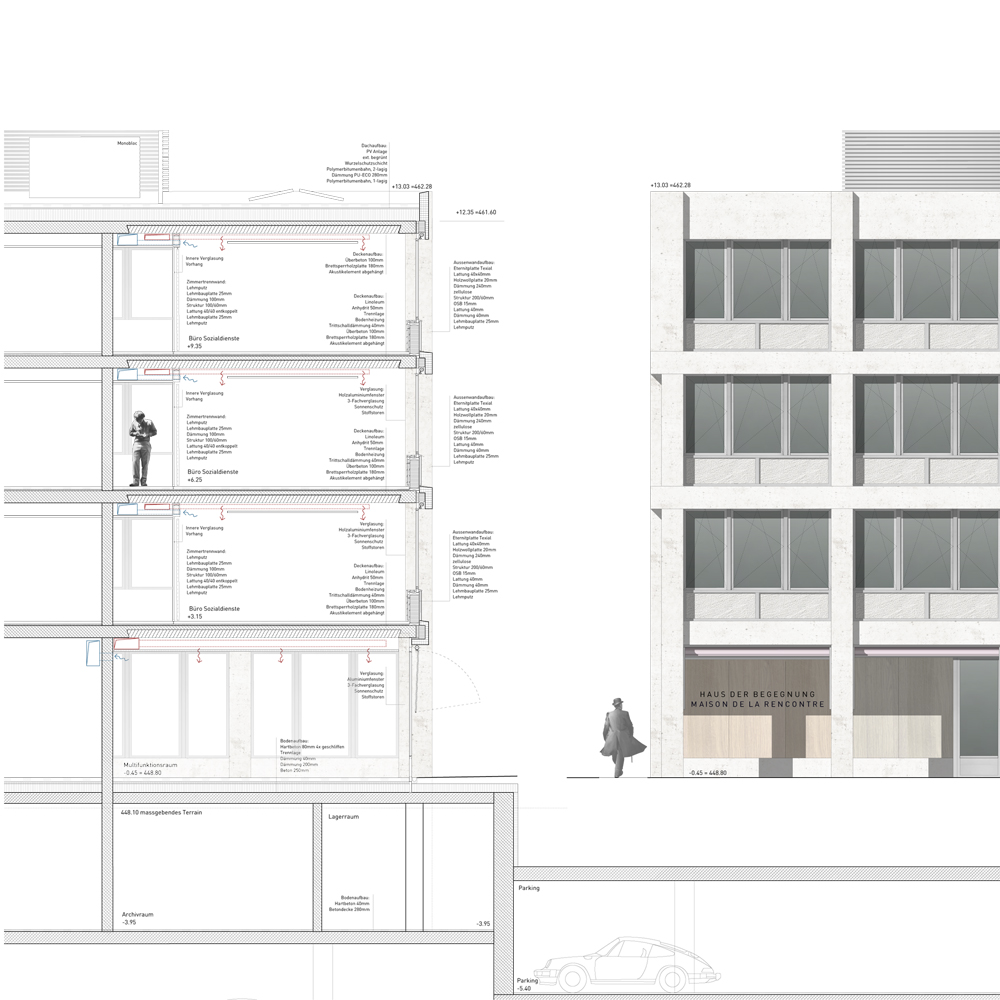Beim Haus der Begegnung handelt es sich um ein Gewerbehaus mit überhohem Erdgeschoss und drei Bürogeschossen. Dank mittigem Kern und lateral gelegenem Treppenhaus sind unabhängige Erschliessungen möglich, die die Sicherheit der Mitarbeiter und Besucher gewährleisten. Die Geschosse können als Mieterausbau flexibel gestaltet werden.