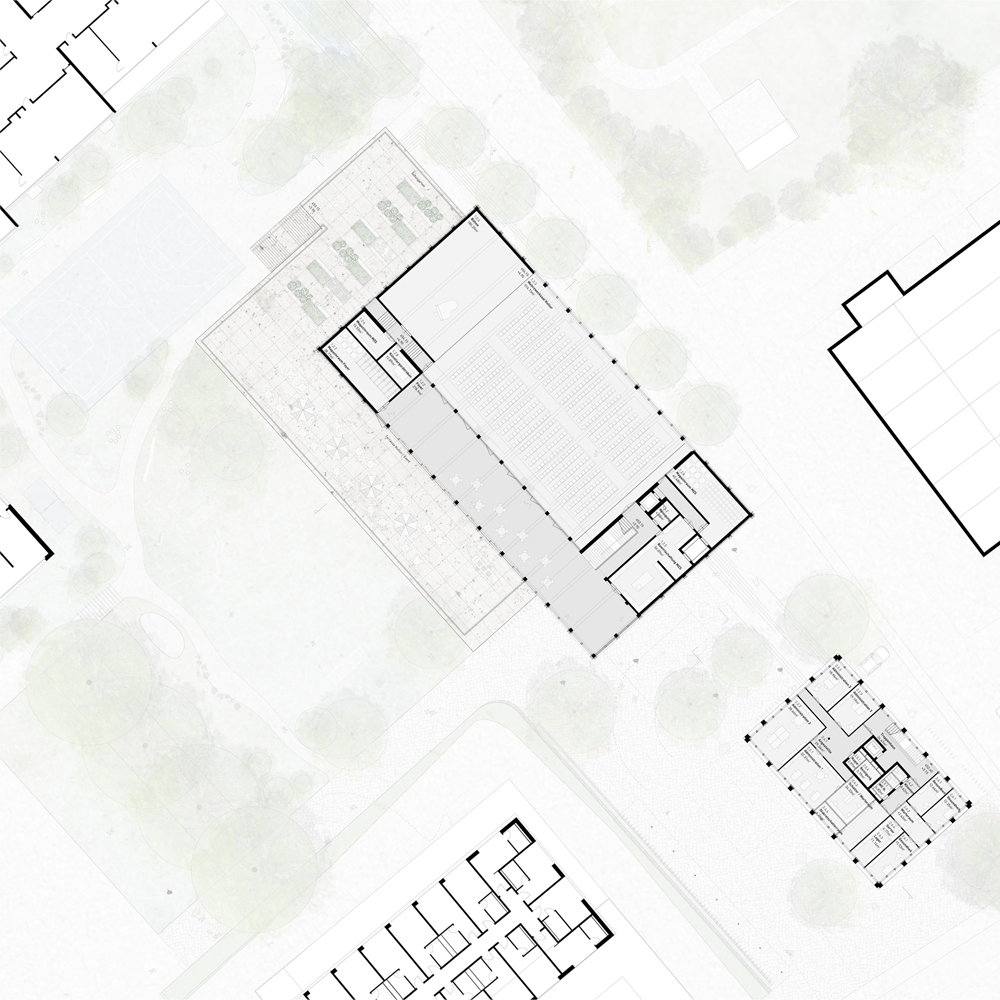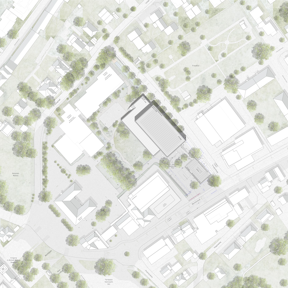 Entlang des Friedhofwegs entsteht zwischen den beiden Neubauten ein zusätzlicher kleinerer Platz mit Treppenanlage, der zum Verweilen einlädt. Ausserdem erfolgt eine weitere Erschliessung der Tribüne sowie die Anlieferung ebenerdig entlang des Friedhofwegs. Die Transparenz der Fassade als auch die Eingänge entlang des Friedhofwegs schaffen räumliche Bezüge und bedeuten so eine städtebauliche Aufwertung. Weiter nördlich werden die Schulnutzungen angeschlossen: das Schulhaus Längmatt, die Aussensportfelder sowie der Zugang zur Dreifachturnhalle für die Schülerschaft.