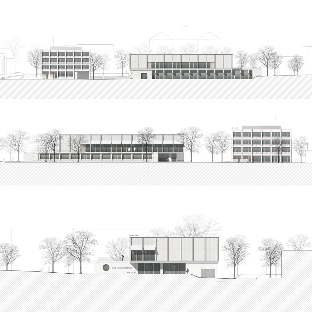 Die heterogene Situation, die verschiedenen Nutzungsgruppen sowie das kompakte L-förmige Baufeld bedingen eine geschickte Setzung eines mehrteiligen Gebäudekomplexes mit differenzierter Höhenstaffelung.  So können die Bereiche der unterschiedlichen Nutzergruppen entflochten werden und gleichzeitig kann auf die spezifische städtebauliche Situation reagiert werden.